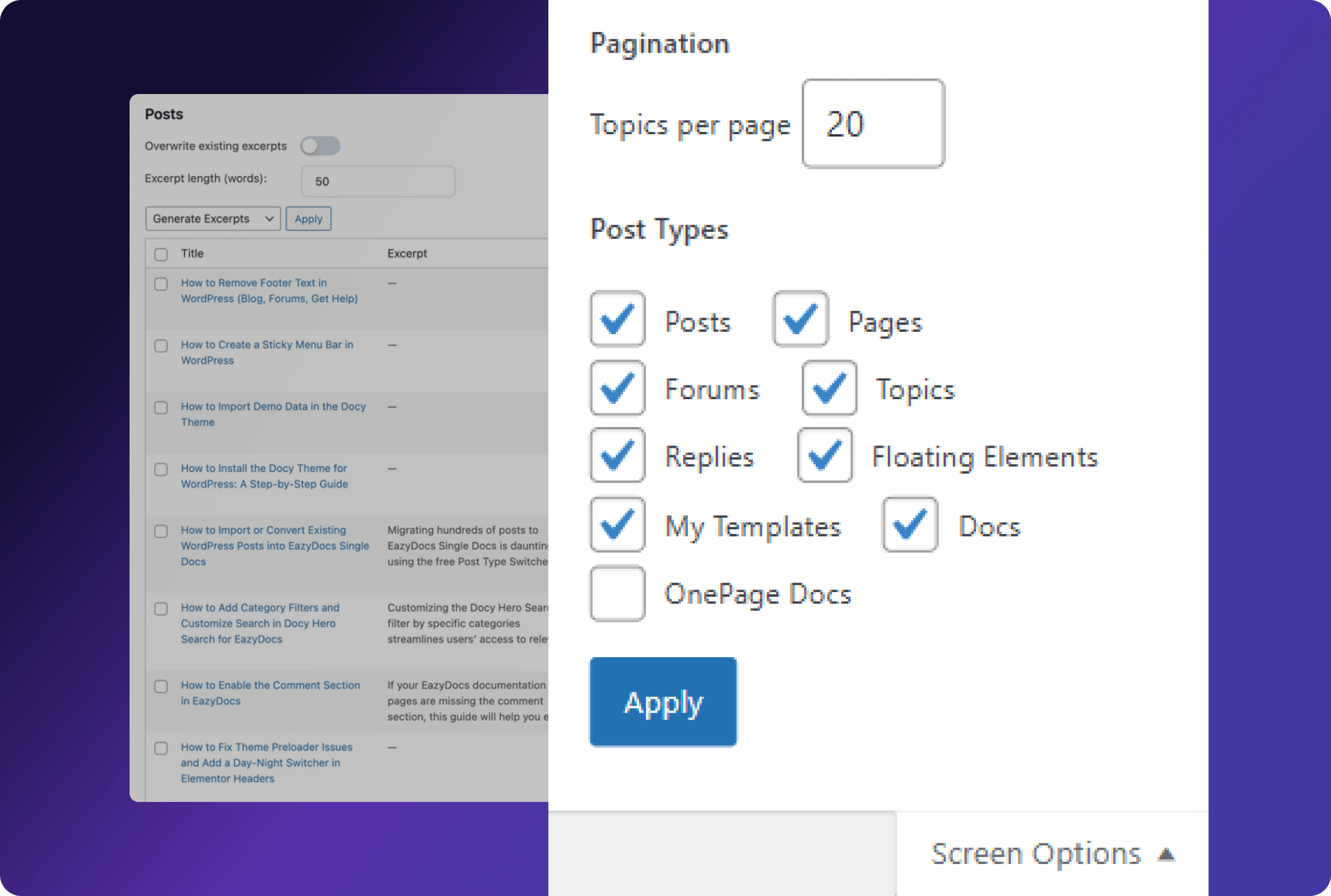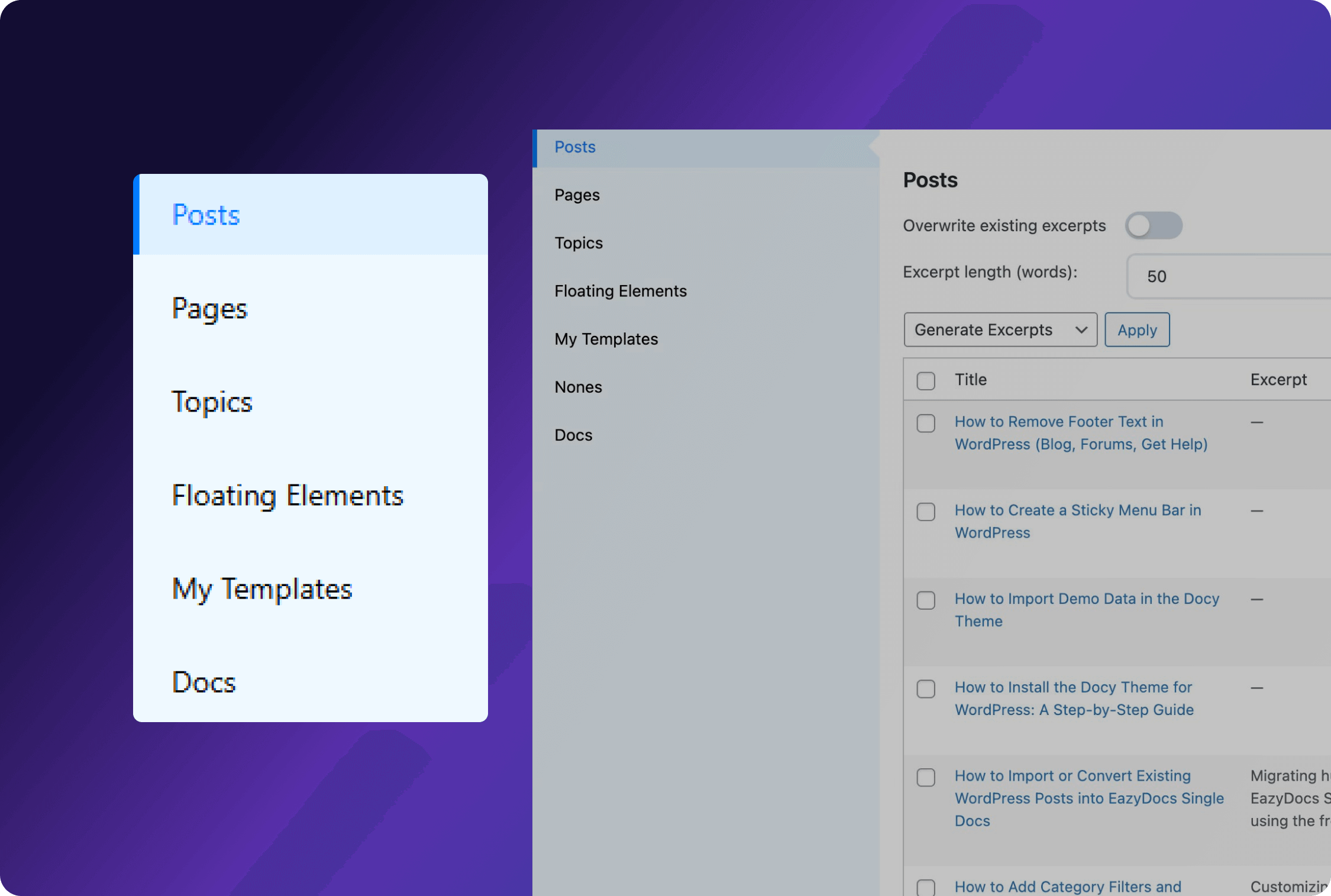 Gain unified control of site content. Manage excerpts across Posts, Pages, Topics, and Templates. Apply settings seamlessly to maintain consistent, engaging summaries for every published WordPress content type.