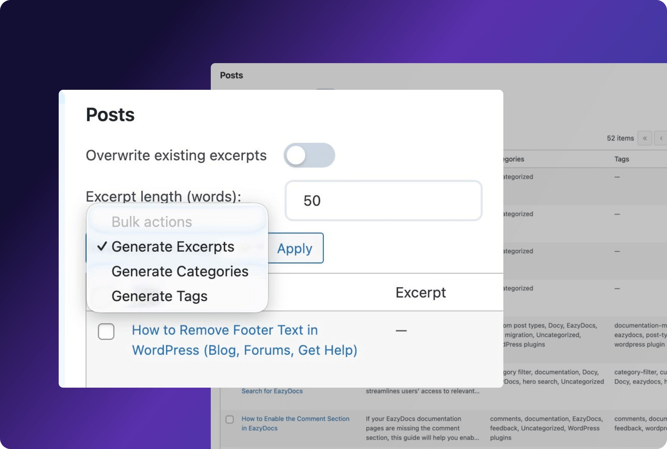 Simplify content management with automated excerpt generation. Select posts and generate professional summaries instantly, saving time while ensuring consistency across your entire WordPress website.