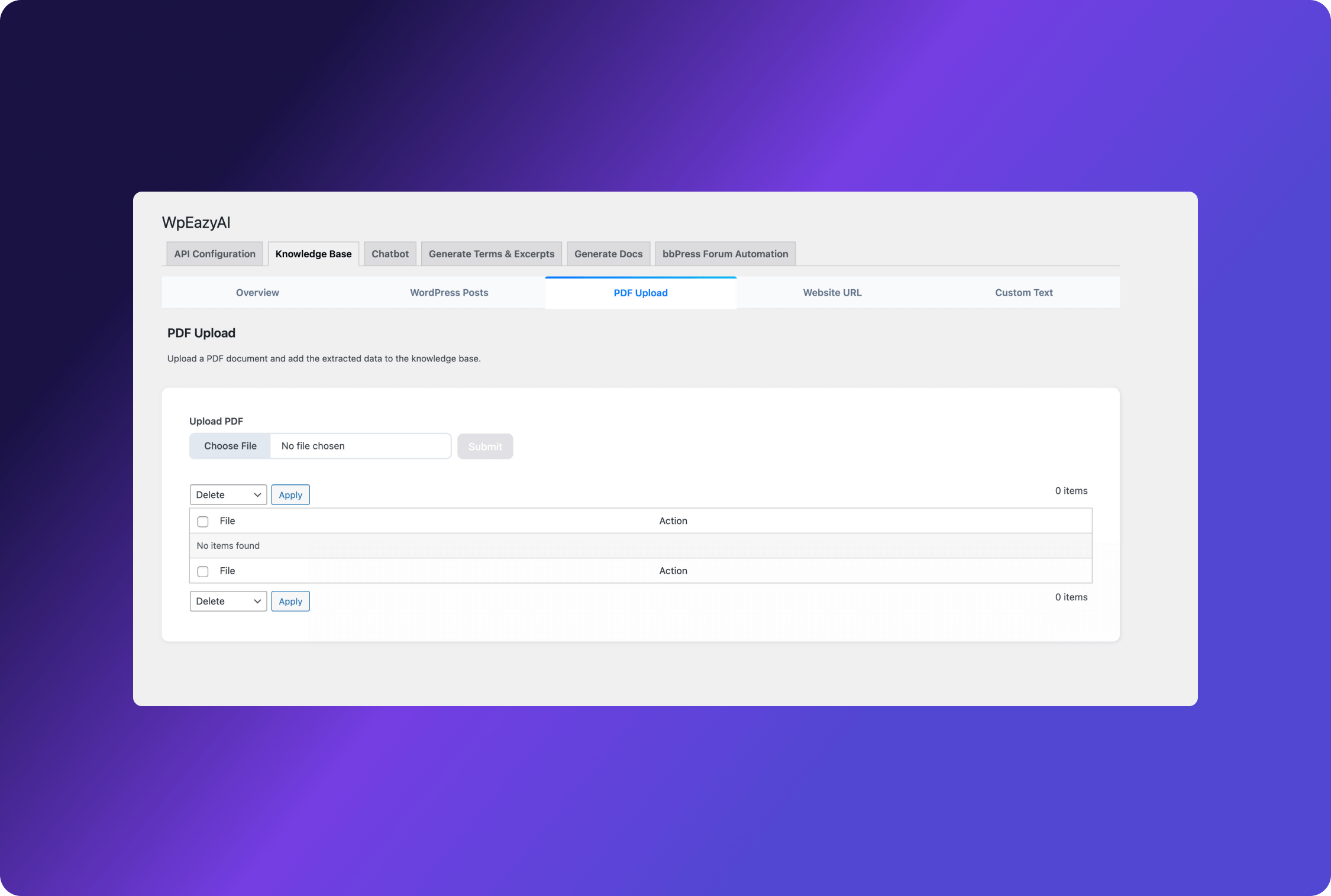 Effortlessly turn your WordPress posts, PDFs, and website content into an AI knowledge base. Power a smart chatbot that answers accurately, built on your expertise.