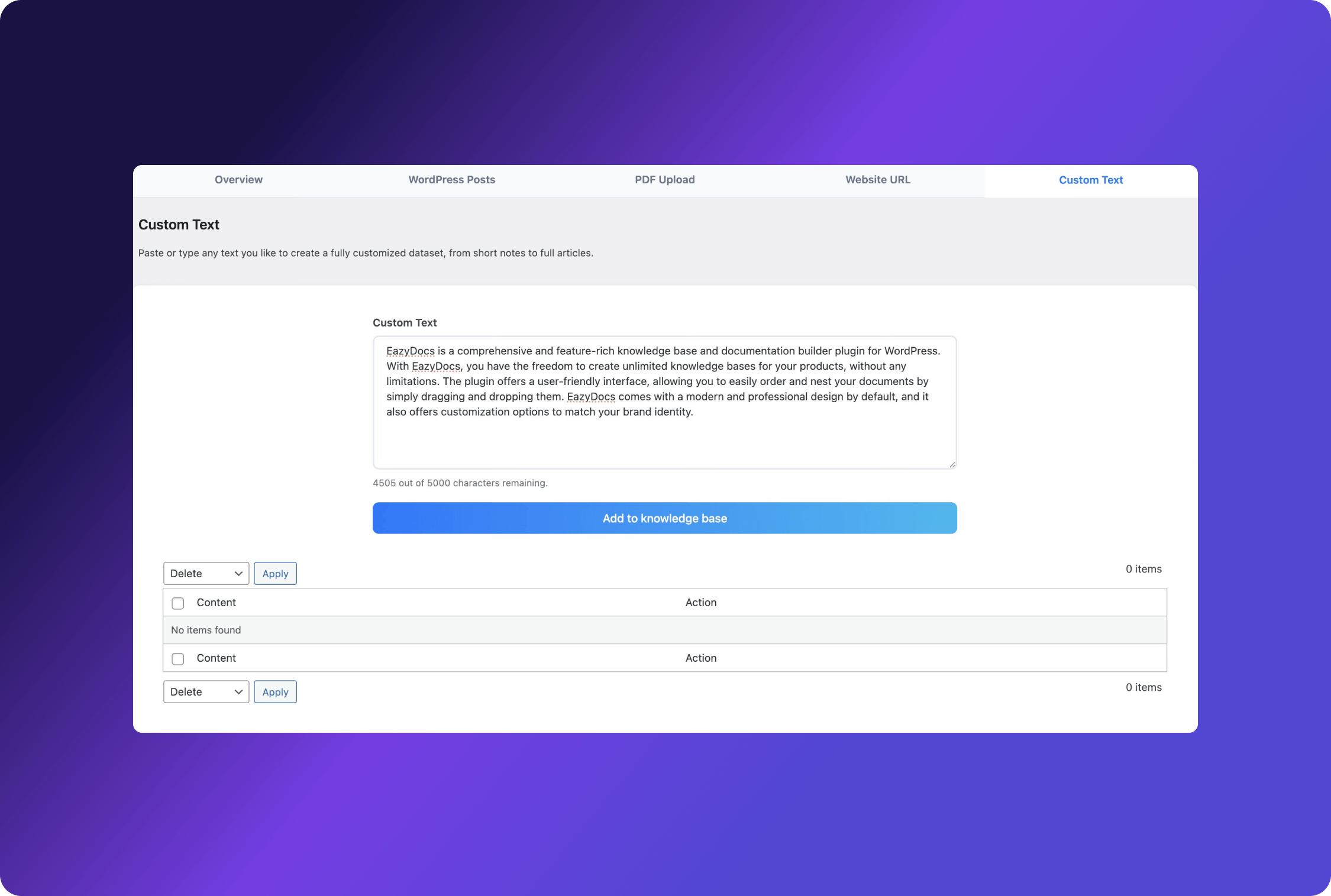Train your AI with posts, pages, documentation, and even floating elements directly from your WordPress site.