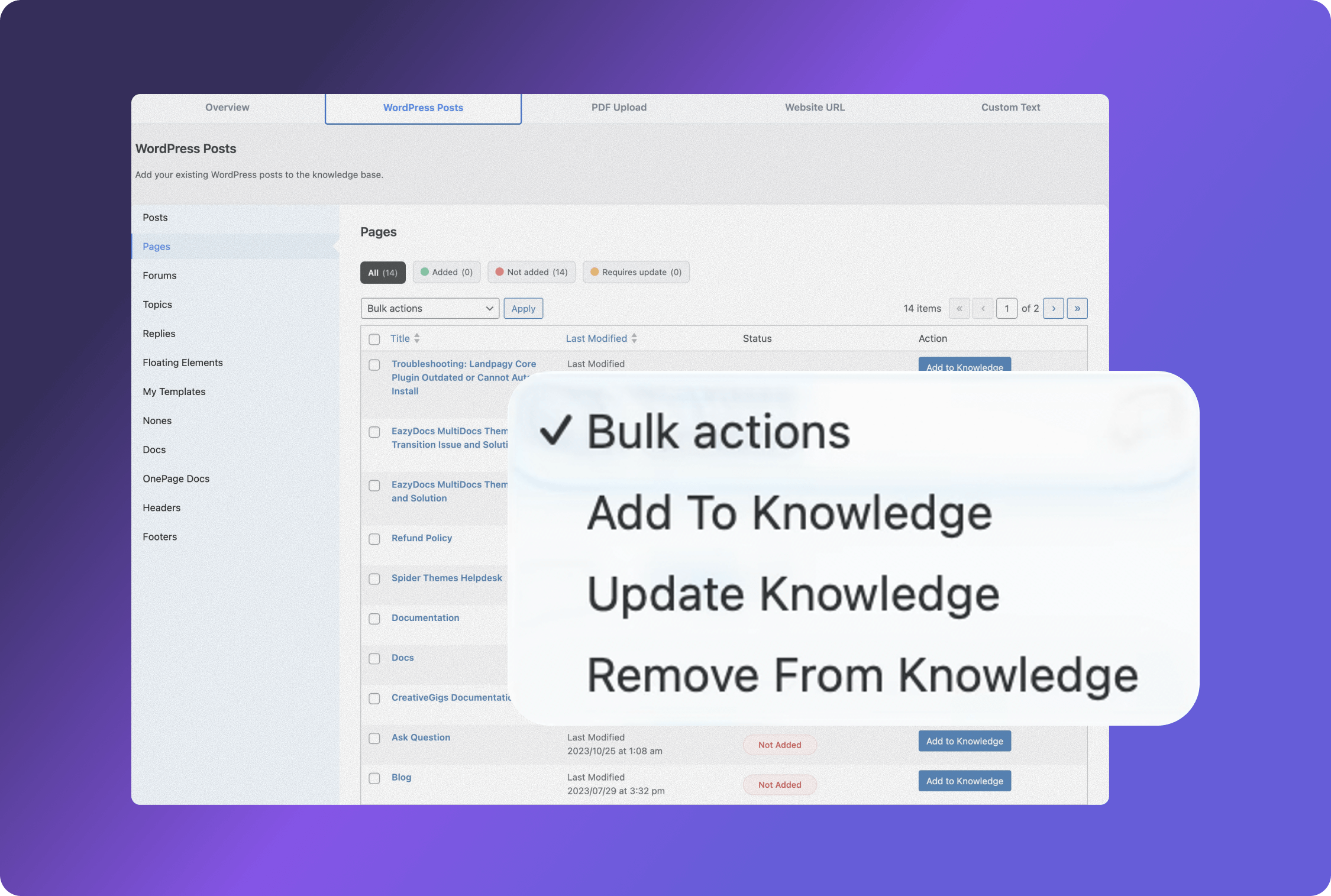 Use Bulk Actions to easily Add, Update, or Remove multiple pieces of content from your AI’s knowledge base simultaneously. This feature gives you efficient control over exactly what your intelligent chatbot learns and shares.